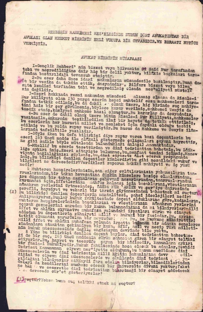 "Rehberin Mahkemesi Meselesinde Nur'un Dört Avukatından Bir Avukatı Olan Mehmet Mihri'nin Ehli Vukufa Bir Cevabıdır ve Beraatı Netice Vermiştir."