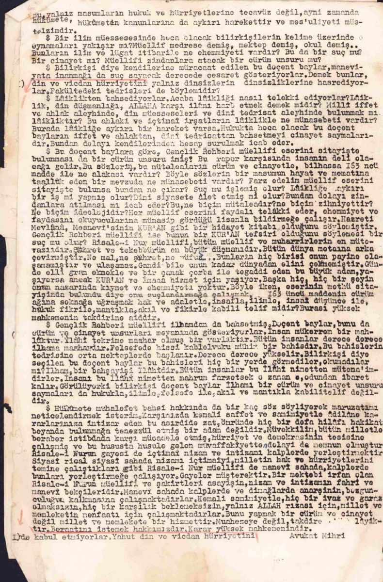 Risale-i Nur’un gayesi de içtimaî nizam ve intizamı kalplere yerleştirmektir. Siyasî rical, siyasî sahada nizam-ı içtimaîyi, milletin hak ve hürriyetlerini temine çalıştıkları gibi Risale-i Nur müellifi de manevî sahada, kalplerde bunları yerleştirmeye çalışıyor. Gayeler müşterektir. Bir mekteb-i irfan olan Risale-i Nur’un müellifi ve şakirdleri asayişin, nizam ve intizamın fahrî ve manevî bekçileridir. Manevî sahada, kalplerde ve dimağlarda anarşinin, bozgunculuğun kalkmasına çalışmaktadırlar. Kemal-i samimiyetle, hiçbir ivaz ve garaz olmaksızın, hiçbir karşılık beklemeksizin, yalnız Allah rızası için millet ve memleketin menfaati için çalışmaktadırlar. Bunu yapmak bir cürüm ve cinayet değil, millet ve memlekete bir hizmettir. Muahezeye değil, takdire lâyıktır. Beraetini istemek hakkımızdır. Karar yüksek mahkemenindir.
