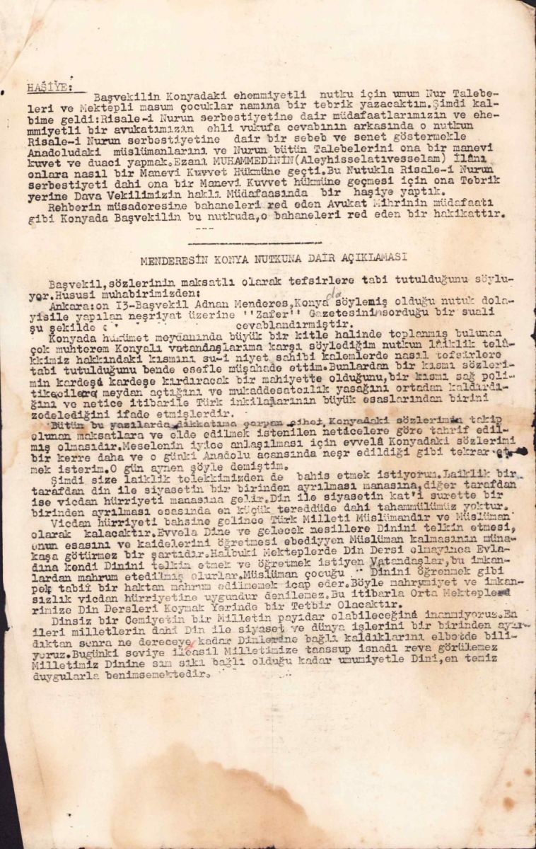Hâşiye: Başvekilin Konya’daki ehemmiyetli nutku için umum Nur talebeleri ve mektepli masum çocuklar namına bir tebrik yazacaktım. Şimdi kalbime geldi: Risale-i Nur’un serbestiyetine dair müdafaatlarımızın ve ehemmiyetli bir avukatımızın ehl-i vukufa cevabının arkasında o nutku, Risale-i Nur’un serbestiyetine dair bir sebep ve senet göstermekle Anadolu’daki Müslümanları ve Nur’un bütün talebelerini ona bir manevî kuvvet ve duacı yapmak, ezan-ı Muhammedînin ilanı onlara nasıl bir manevî kuvvet hükmüne geçti; bu nutukla Risale-i Nur’un serbestiyeti dahi ona bir manevî kuvvet hükmüne geçmesi için ona tebrik yerine, dava vekilimizin haklı müdafaasında bir hâşiye yaptık. (*)