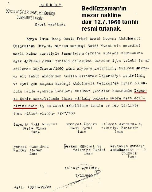 Said Nursi'nin mezar yeri 53 sene sonra Başbakanlık arşiviyle ortaya çıktı. Tutanaklara göre Nursi'nin kabri Isparta Şehir Mezarlığı'nda.