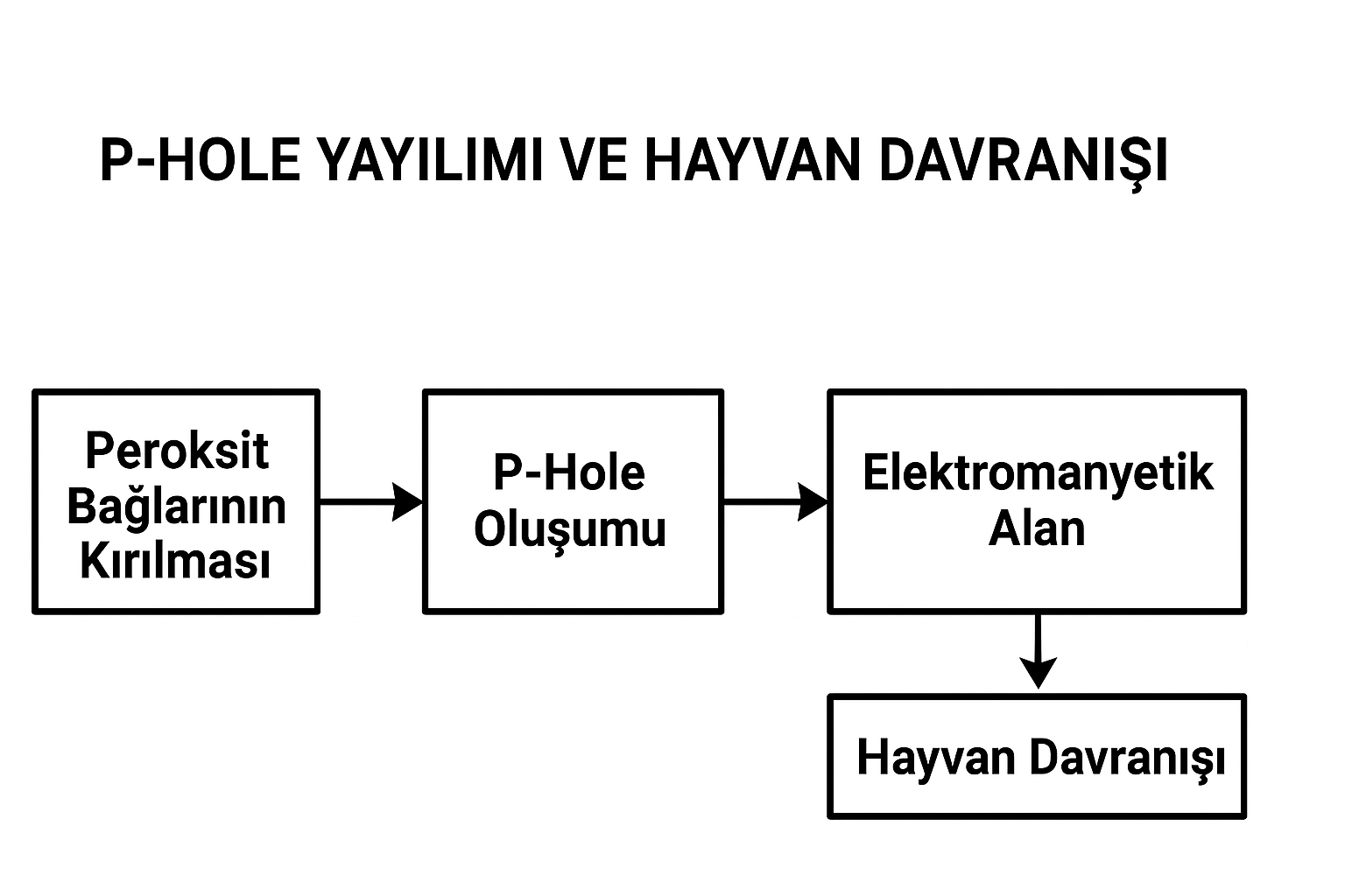 Yer kabuğunda stres birikimi başladığında peroksit bağlarının kırılması, p-holes oluşumu ve bu yük taşıyıcılarının yüzeye doğru yayılımı, sonrasında ise elektromanyetik anomali oluşturma süreci tasvir edilmiş AgUpubs.